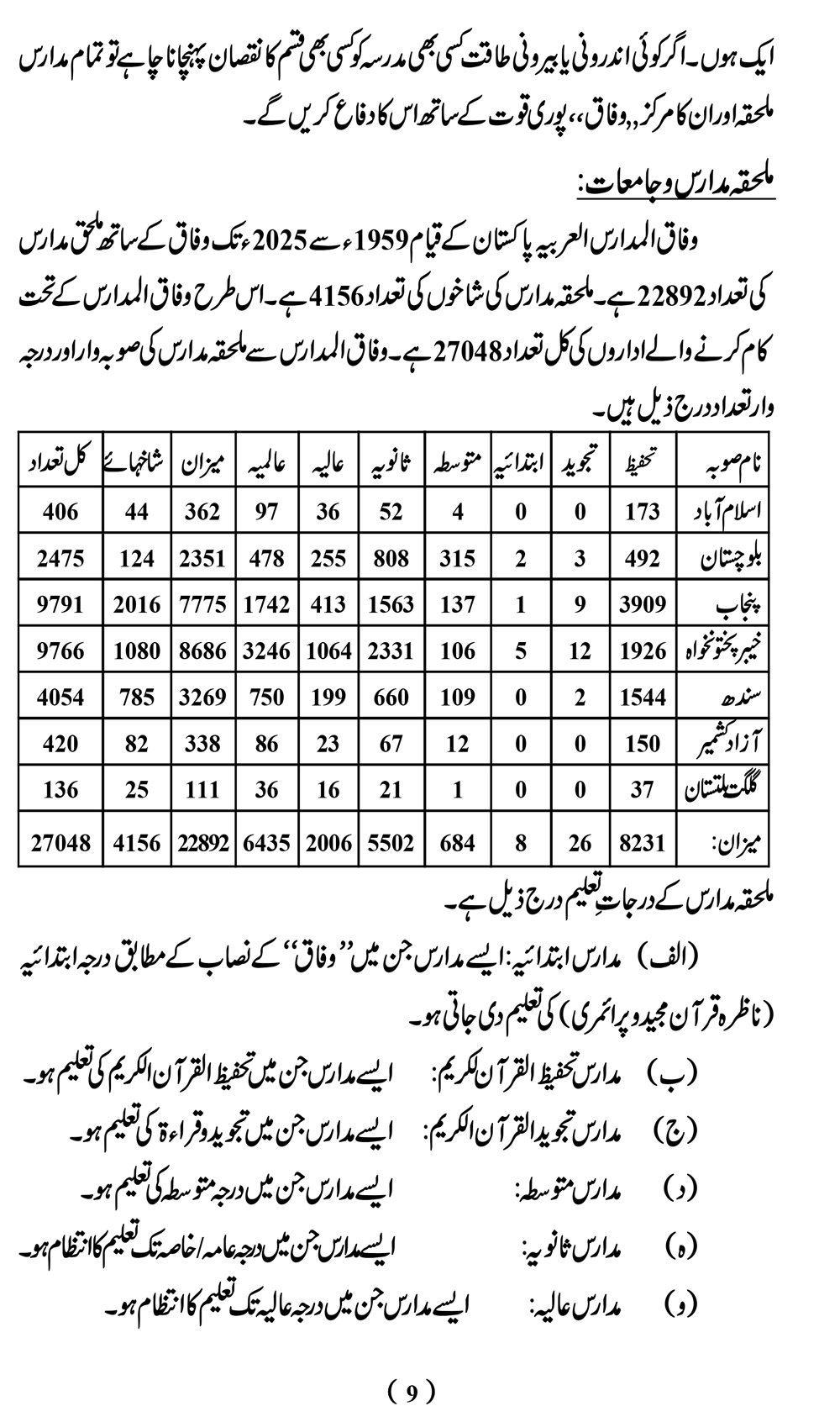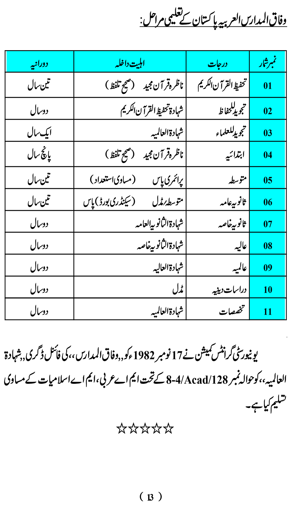 وفاق المدارس کے تعليمى مراحل